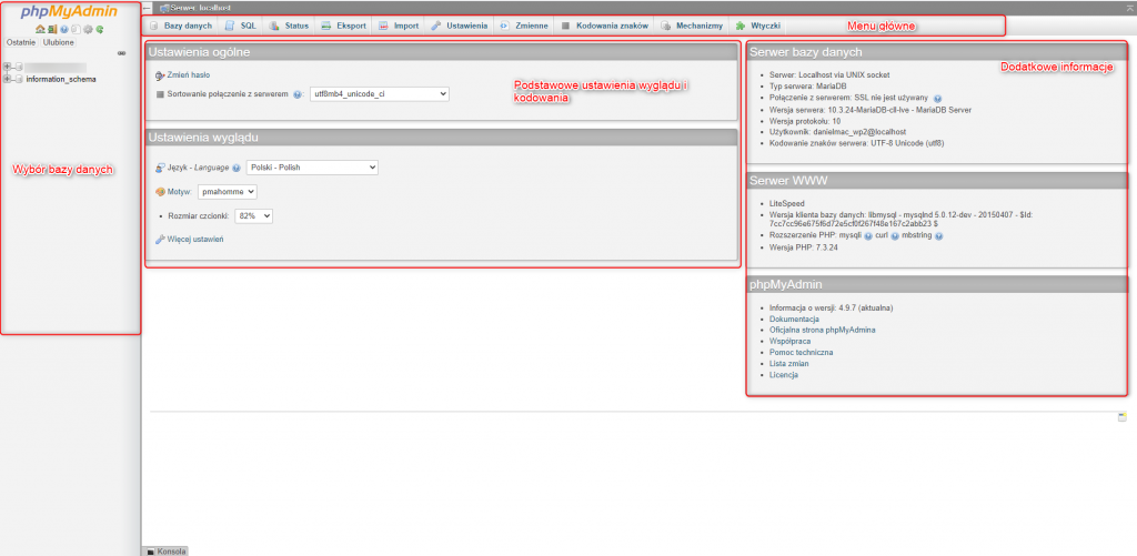 - Informacje o serwerze bazy danych znajdziesz w kolumnie po prawej stronie.