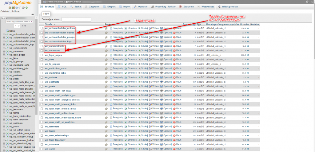 Baza danych WordPress ma prostą strukturę zawierającą 12 tabel. Dokładny opis całej struktury możesz znaleźć w oficjalnej dokumentacji WordPress. Jeśli wybierzesz bazę danych, będziesz mógł zobaczyć tabele, które ją tworzą i które zawierają dane. Domyślne tabele bazy danych mają przedrostek wp_, (możesz go zmienić, aby zwiększyć bezpieczeństwo serwisu WWW. )